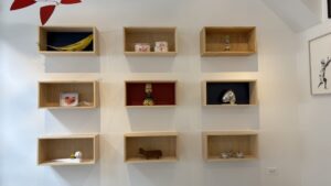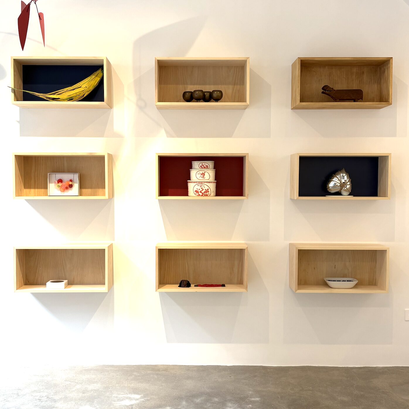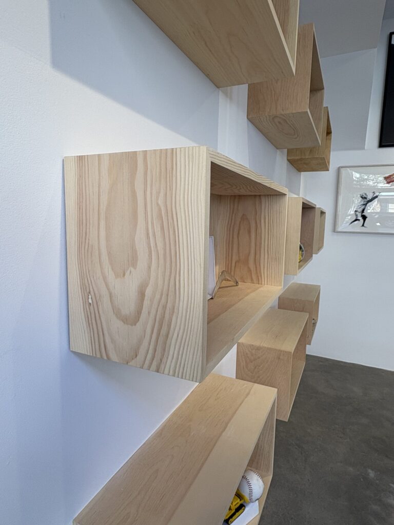 Solid pine wall mounted shelving comprised of rectangular cubbies with recessed aluminum cleats. These units are available individually or as a group, with or without laminate backs. Units are offered naturally as shown or can be finished in a variety of ways for an uncharge. Email or call to discuss your specific needs, or order the set as shown. Lead time is about 4 weeks.